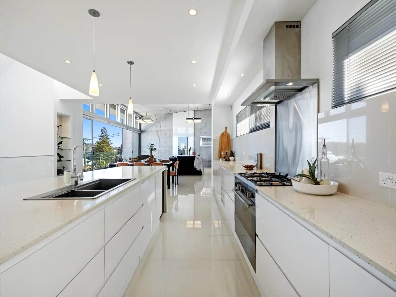 A grand underground entrance worthy of James Bond leads to dramatic cathedral ceilings, gleaming polished floors, and cooling concrete walls, creating a stunning, airy space where light floods in. The formal lounge commands a breathtaking view of Forresters Beach all the way to Terrigal.