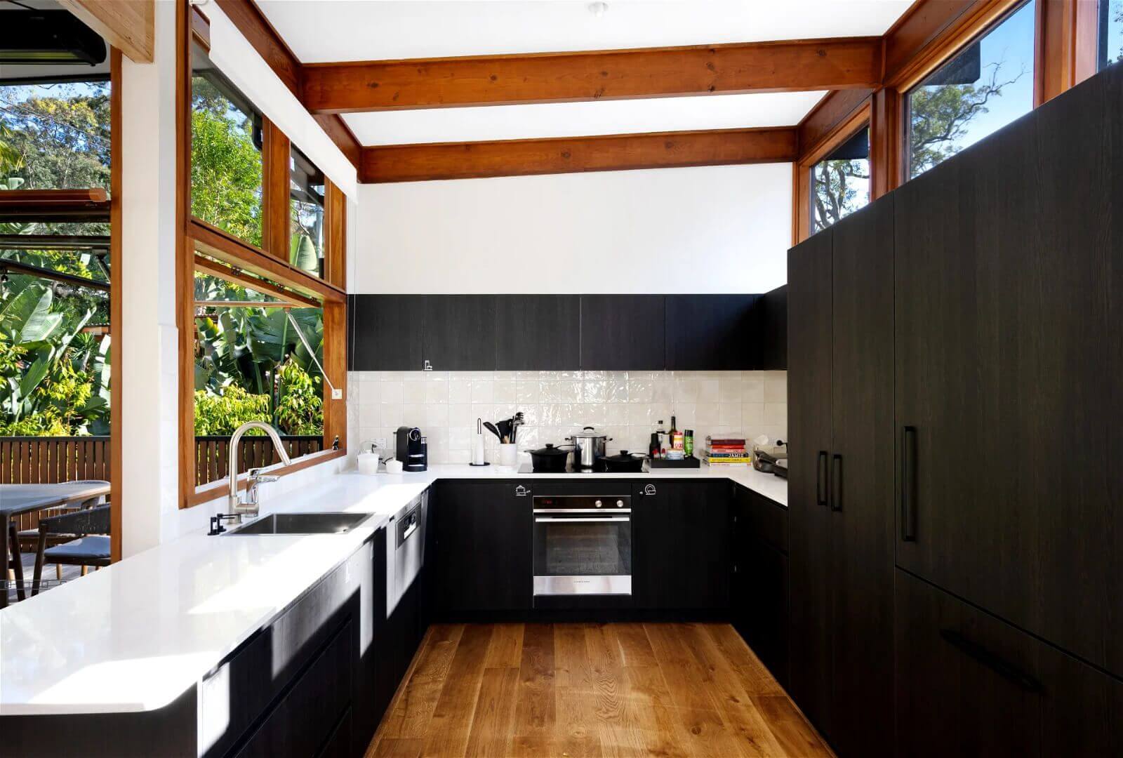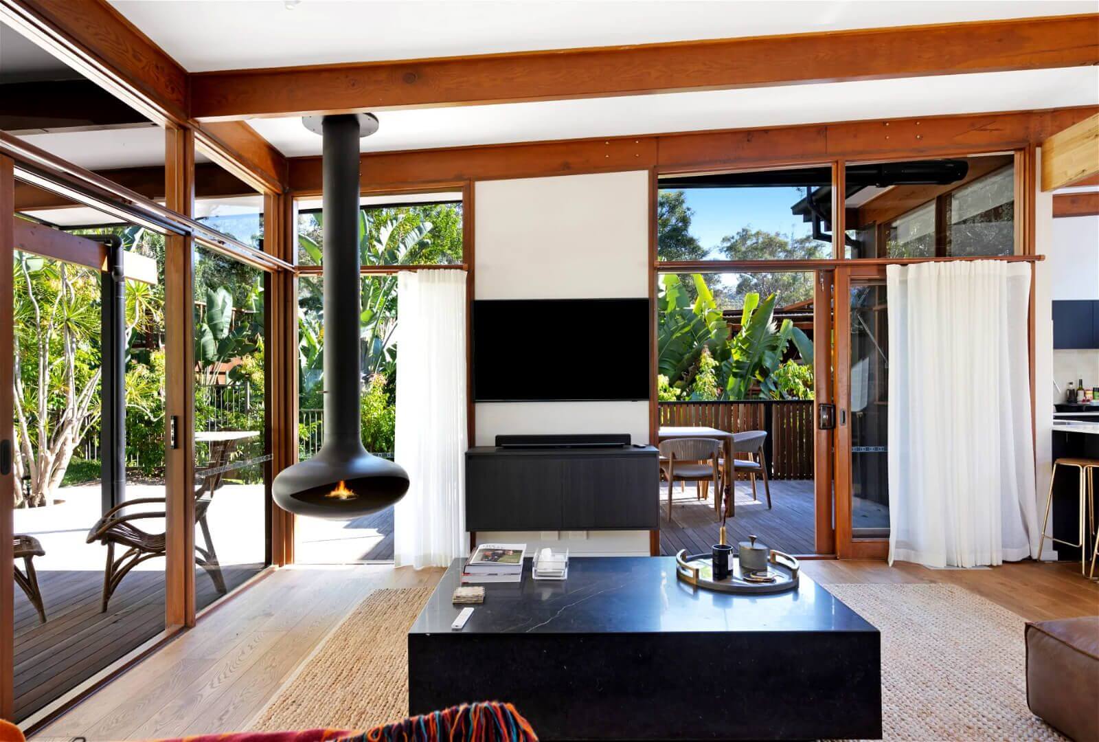 Each room in the house frames the breathtaking views of the stunning Pearl Beach tree canopy meeting the sky, offering a picturesque backdrop that enhances the natural atmosphere.