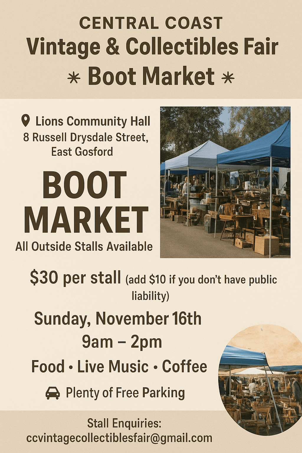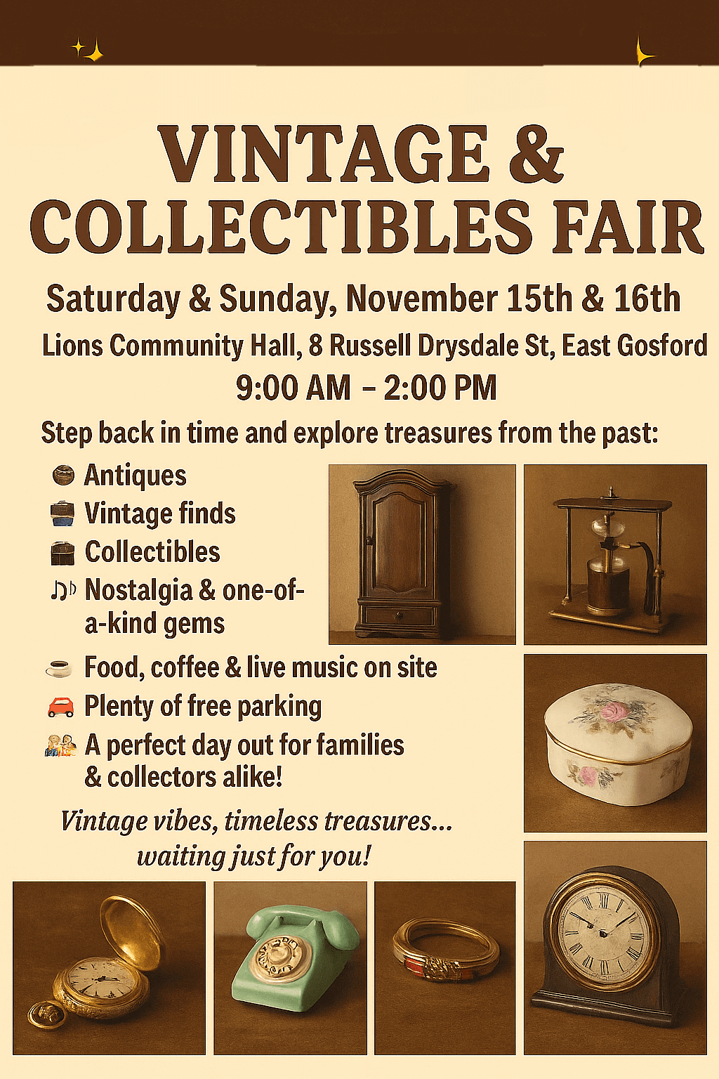 Our Fairs at the Lions Club in East Gosford promises to be a treasure trove for enthusiasts and collectors alike. Our events bring together a diverse array of vendors showcasing a rich selection of antiques, Vintage items, Artisans and unique collectibles. Attendees will have the opportunity to explore exquisite peices that reflect history craftsmanship and nostalgia. With expert dealers on hand to share insights and stories behind the items, our Fair is an excellent chance for both seasoned collectors and newcomers to discover hidden gems.