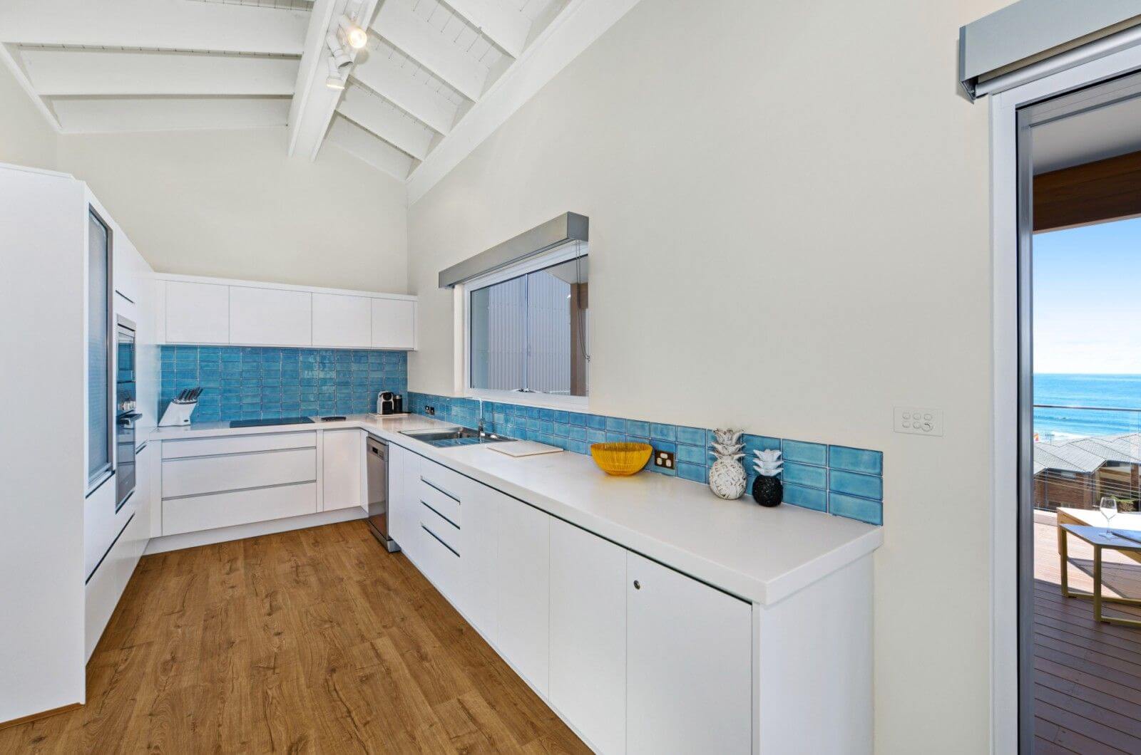 On entry is a large rumpus room complete with flat screen TV and DVD player with loads of space for kids to play or a teenage retreat. Airy beach decorated bedrooms are located on this level. Main bedroom with queen bed, bedroom 2 with 2 king single beds and bedroom 3 with 2 single beds. All linen is provided. All bedrooms have sea views. The property is also air conditioned upstairs and all bedrooms have fans.